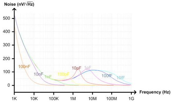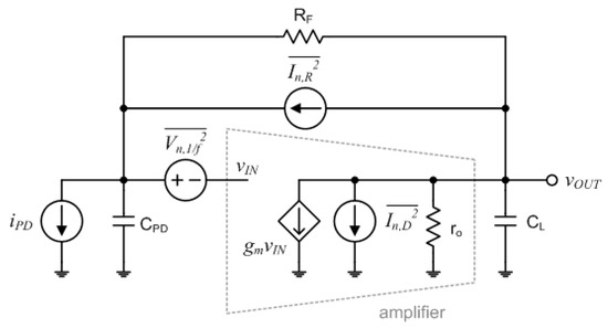 In addition, the equivalent spectral density of the input referred noise current of the TIA is expressed as follows [25,26,27,28,29]: