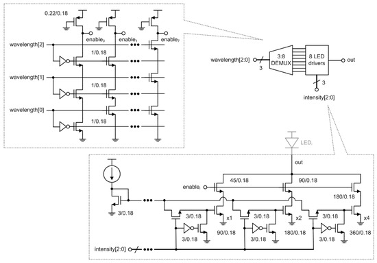 Figure 14 shows the architecture of the 3:8 DEMUX and eight LED drivers. The 3:8 DEMUX was implemented in a pseudo NMOS logic and carries out binary to thermometer decoding to turn on one of eight enable signals based on a 3b digital control word, wavelength [2:0]. The LED driver appropriately switches on three NMOS current sources whose W/L ratios are scaled as x1, x2, and x4, respectively, according to another 3b digital control word, intensity [2:0]. Thus, the output DC current of the LED driver can be increased up to 21 mA with a step size of 3 mA. Among the eight LED drivers, only one whose enable signal is set to high drives the corresponding LED at a time.