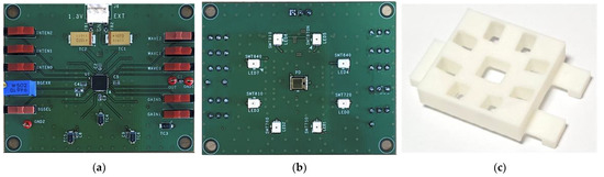 An integrated NIR spectroscopy prototype module was implemented in a 0.18 μm 1P6M CMOS process. This module consists of a low-noise 20 kΩ TIA, a 0 dB–28 dB four-step PGA, a 3:8 DEMUX, and eight LED drivers. The receiver side consumes 2.4 mA from a 1.8 V supply, and the transmitter side consumes 21 mA from an external 2 V supply to drive one of eight LEDs alternately. The total die area is 0.84 mm2. Figure 15 shows the die photo, and Figure 16 shows the (a) front face and (b) back face of the four-layer FR-4 PCB on which the integrated NIR spectroscopy module packaged in a 28 pin micro lead frame (MLF) is mounted. On the front face of the PCB, the integrated NIR spectroscopy module is located with the supply connector and the several digital control switches, and on the back face of the PCB, there are eight LEDs surrounding the PD located at the center. Additionally, we built a chassis using a 3D printer [30], as shown in Figure 16c, to combine the flat-shaped PCB and the globular-shaped apples more closely. In addition, we attached a copper tape on the inside walls of the chassis to shield and protect the ambient light coming through from the LEDs to the PD directly. Figure 17 shows the sugar content measurement setup using the implemented NIR spectroscopy module. The wavelength and the intensity of LEDs were manually controlled in sequence using the on-board digital switches, and the DC output signal of the PGA was measured by using the high-resolution digital multi-meter.