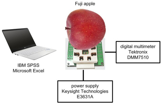 Figure 2a shows the direct sugar content measurement setup using a digital refractometer. To directly measure the sugar content, we should obtain a sample from each apple first by using a sampler. After squeezing each sample, we can obtain a couple of juice drops that are next placed on the lens of the digital refractometer (PR-32a) to measure the sugar content value. This digital refractometer can measure the sugar content value within an accuracy of ±0.1% [21].