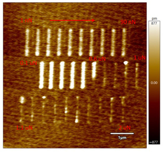 In this section, experiments are performed over the silicon substrate dipped in 10% HF solution to remove the native oxide layer over the substrate. When the experiments are performed drawing lines on the surface using a platinum-coated conductive tip, the results are similar to that obtained over the bare silicon, as shown in Figure 8. Distinct oxidation can be seen over the surface for different voltages ranging from 0 V to 10 V, with a VT of 1 μm/s and an FT of 0.1 μN. Hence, it can be concluded that no matter whether there is a native oxide layer or not, oxidation happens with the platinum-coated tip.