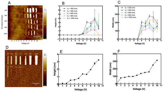The lines drawn on the surface under different humidity conditions: (A) The formation of oxide deposits with different tip velocity and voltage (B) The height vs. tip bias and (C) Width vs. tip bias of the lines scratched on the silicon surface. FT = 0.1 μN. RH is 36% (D) The lithographical lines drawn on the substrate with different voltage with a relative humidity of 75% and VT = 1 μm/sec. FT = 0.1 μN (E) The height vs. tip bias and (F) width vs. tip bias characteristics.