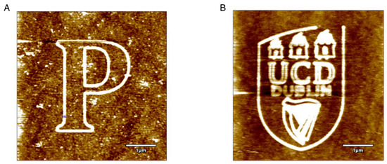 The intrinsic patterns fabricated over silicon substrate: (A) Letter ‘P’, and (B) UCD logo. FT = 0.1 μN and tip bias of 7 V, RH = 75%, VT = 1 μm/s.