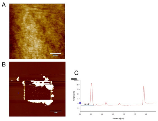 The contact mode scanning over silicon surface using single crystal diamond tip: (A) The polished 2 × 2 μm area by contact mode scanning with a force of 2 μN. (B) The accumulation of debris on the sides and the (C) the line profile showing a depression of 1.89 nm. Tip bias: 0 V and RH ~75%.