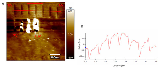 The scratched lines and the line profile with different tip voltage over silicon substrate with diamond tip: (A) The scratched lines over silicon using single crystal diamond AFM tip with different tip voltage ranging from 0 V to 10 V with constant velocity (B) The line profile of the trenches (non-flattened). FT = 4 μN and the humidity is ~75%.
