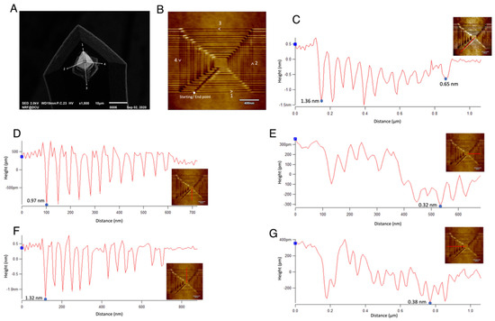 To understand more about the influence of material depth with respect to different directions, a concentric square is scratched over the substrate under normal room conditions (room humidity 25–30%), as shown in Figure 7B. A clearer criterion in which the square was scratched is given in Figure A2. From Figure 7B, some of the lines are deeper, and some lines are less prominent. This is because of the tip geometry. The SEM analysis of the diamond tip before scratching is shown in Figure 7A. In the figure, different sides are represented in numbers for an easy explanation of the analysis. The numbers in Figure 7B depicts the same numbers from Figure 7A, through which different sides of the AFM tip passes during the scratching process, shown by the arrows. The scanning is performed at the 0° angle, where the lines are horizontally scanned with side 1 and retraced with side 3 of the tip. As it can be seen, the starting and end point of the square is much deeper, as can be seen from the line profile starting from the centre of the square, shown in Figure 7C. A possible reason for this is the impact of the tip while starting and finishing the scratch at the same point. Another inference is that depth decreases as the size of the square increases. The depth is as deep as 1.36 nm for the smallest and the innermost square, while the outermost square has a depth of merely 0.65 nm. This is because of the time duration of the scratching between the start and end point.