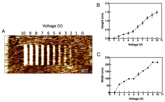 However, when the experiments were performed in the presence of humidity, the LAO behaved differently. The formation of oxides on the surface became consistent and more pronounced than in the ambient air. Figure 3D shows the different lines drawn on the silicon surface with a humidity range of 75–90%. From Figure 3E,F, it can be seen that there is a consistent increase in the width and height of the deposits occurring on the surface. The threshold to obtain the deposits were 6–7 V under ambient conditions, whereas the deposits start to be clearly visible from as low as 2 V. This indicates that the LAO is largely influenced by the presence of relative humidity. This allows the easy formation of oxides and enhances the formation of a water meniscus at the tip-substrate junction.