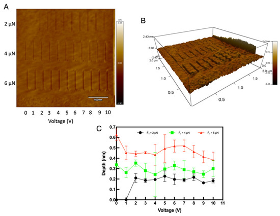 Scratching tests on HF treated silicon: (A) The etched lines on the silicon surface with different forces and voltages (B) The 3D image of the same where the etched depth can be seen clearly increasing with higher force (C) The depth vas voltage graph showing the influence of different tip force.