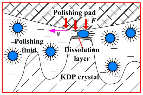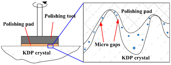 In actual processing, the surface of KDP crystals and a polishing pad with a certain degree of elasticity do not perfectly fit each other. A large number of small-size gaps exists between the rough peak of the crystal surface and the polishing pad (as shown in Figure 5). Selective localized water-dissolution at the rough peaks of the crystal surface can only occur when the polishing fluid is able to enter these gaps sufficiently. During the polishing process, if the polishing fluid cannot be guaranteed to fully enter the small-size gaps between the polishing pad and the KDP crystal, the rough peak will lack sufficient polishing fluid to ensure that material removal occurs. Thus, even direct contact friction between the polishing pad and the crystal surface will occur locally, which will have a negative effect on the quality of the polished surface and directly affect the acquisition of an ultra-smooth surface.