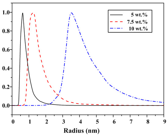 The size of the micro water droplets in the “water-in-oil” polishing fluid is directly related to the polished surface roughness. If the size of the micro water droplets is too large, the ultra-smooth surface with nanoscale roughness will not be formed. The micro water droplet size in the polishing fluid with different water contents was measured by a dynamic light scattering (DLS) instrument (model no.: ALV-NIBS); the results are shown in Figure 2. The micro water droplet radius was basically distributed within 10 nm, which proves the feasibility of the above described removal mechanism. Note also that the micro water droplet size in polishing fluid increases with the increase of water content in the polishing fluid. The average values of micro water droplet radius when the polishing fluid contained 5 wt.%, 7.5 wt.%, and 10 wt.% water were approximately 0.6 nm, 1.2 nm, and 3.8 nm, respectively. Theoretically, the lower the water content of the polishing fluid, the smaller the size of the micro water droplets—which should be more favorable for the selective removal of crystal surface roughness peaks—and the lower the surface roughness after polishing.
