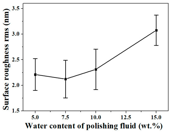 In a previous study, we analyzed the variation pattern of the surface roughness of KDP crystals after polishing with the water content of the water-dissolution polishing fluid (as shown in Figure 3). When the water content was greater than 7.5 wt.%, the surface roughness decreased significantly with the decrease of water content, as expected. However, when the water content was reduced to 5 wt.%, the surface roughness value after polishing was higher than that at 7.5 wt.% [21], and it did not keep decreasing with the decrease in water content, which was inconsistent with the theoretical analysis based on the micro water droplet size.