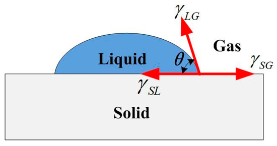 The surface of the polyurethane polishing pad was covered with pores and channels. It provided a certain storage capacity for polishing fluid, which could quickly penetrate into the surface layer of the polishing pad. Thus, the contact angle of the polishing fluid on the surface of the polishing pad can be approximated to be close to 0°. Therefore, in the present study, we assumed that the contact angle of the water-dissolution polishing fluid on the surface of KDP crystal was the main parameter impacting Ea. The contact angle can be a direct measurement of the wettability of a fluid on a solid surface, i.e., the ability and tendency of a fluid to spread out on a solid surface. It is the angle between the tangent line of the liquid–gas interface and the solid–liquid interface at the junction of the solid–liquid–gas phase (as shown in Figure 6). The contact angle satisfies the Young equation: