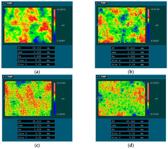Figure 9. Surface roughness of KDP crystal after polishing with different water contents of polishing fluid: (a) 5 wt.%, (b) 7.5 wt.%, (c) 10 wt.%, and (d) 15 wt.%.