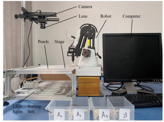 A pearl shape detection system based on machine vision was developed, as shown in Figure 1, including a robot system, a vision detection system, a platform, a sorting box, and a computer. The visual inspection system consisted of a camera, lens, light source, computer, and the objective table. The camera was the Daheng Mercury camera MER-502-79U3M POL camera. The collected picture contained 20 pixels of 1 mm. The optical axis of the camera was perpendicular to the objective table. The lens was a computer series M2514-MP2 lens. The distance from the objective table was 250 mm. The pearls were randomly laid on the objective table. The light source adopted an LED array surface light source with an illuminance of 40,000 Lux. The camera, the pearl to be detected, and the light source acquired the pearl image with backlit imaging. The system software adopted Python3.7 and opencv3.4.2, and the computer performance was by CPU i7-11700k, 16-G memory, and a GTX 2080ti graphics card. A Dobot magician robot was adopted, and the end effector was a SMC-ZP3-T04BN-A5 vacuum suction cup.
