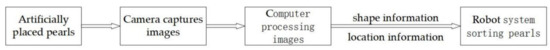 We arranged this paper by the following. Section 1: For the pearl shape detection system, this paper selected the hardware required for robots and visual recognition and built an experimental platform. Section 2: The tangent pearls’ image was segmented based on concave point detection and concave point matching. Pearl shape parameters were measured by extracting the features of the contour edge. Section 3: Through the experimental platform built to conduct the experimental analysis of different numbers of pearl images contacted at different angles, we determined the pearl shape parameters and used the robot to complete the pearl classification according to the recognition results. Section 4: Conclusions.