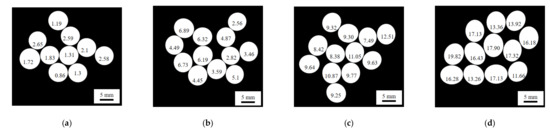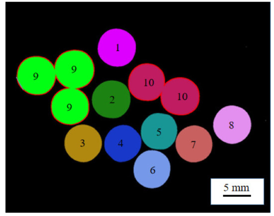The connected domain labeling of the pearl images after binarization is shown in Figure 4. The pixel area of each connected domain was counted as S 1 , S 2 , , S n , as shown in Table 1. The area sequence was sorted and the smallest area was Smin, as expressed by Equation (1).