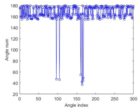 Due to the texture of the pearl surface, the outline angle fluctuated and the actual concave point was relatively small. As shown in the angle distribution diagram shown in Figure 6 calculated by Equation (6), the general distribution of angles was within the range of 150°–80°, and the individual angles were within the range of 30°–60°, which can be used for initial pits’ determination.