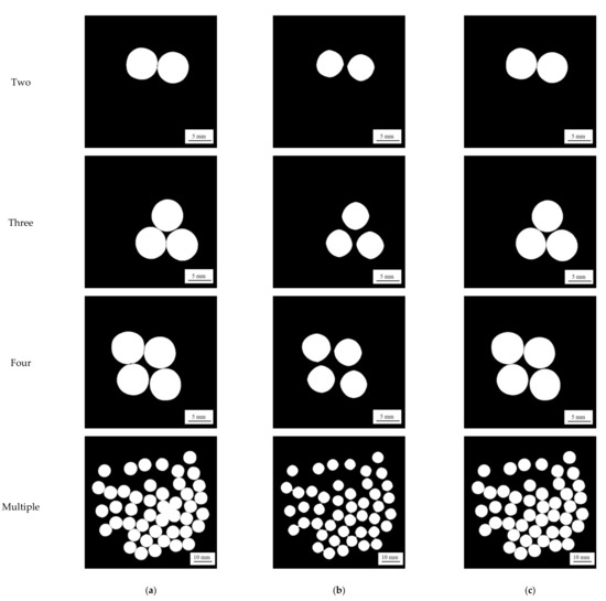 Figure 10. Different methods for different numbers of tangent pearls’ segmentation results. (a) Watershed algorithm; (b) morphological algorithm; (c) proposed algorithm.