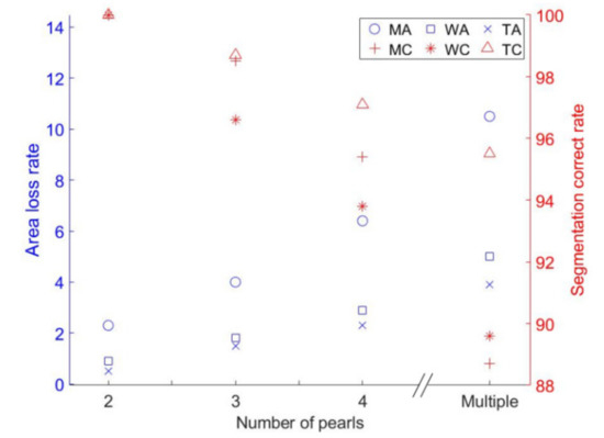 Figure 11 shows the experimental segmentation performance of the three methods, where WA is the loss rate of area of the watershed algorithm, MA is the loss rate of area of the morphological algorithm, and TA is the loss rate of area of the proposed method, MC is the correct segmentation rate of the watershed algorithm segmentation, WC is the correct segmentation rate of the morphological algorithm, and TC is the correct segmentation rate of the proposed method. It can be seen from Figure 11 that the proposed method performed better than the other two methods in the comparison because its segmentation accuracy was less affected by the degree of contact and the average loss rate of area remained within 4%. As the number of tangent pearls increased, the segmentation accuracy of all three methods was reduced and the loss rate of the area was increased. When the number of the tangent pearls was two, all three methods achieved complete segmentation of the tangent pearls. When there were three tangent pearls, the correct segmentation rates of the proposed method, the morphological algorithm, and the watershed algorithm were 98.7%, 98.5%, and 96.6%, respectively, but the area loss rate of the morphological algorithm was higher than the others. When there were four tangent pearls, the correct segmentation rates of the proposed method, the morphological algorithm, and the watershed algorithm were, respectively, 97.1%, 95.4%, and 93.8%. When there were more pearls in contact, the segmentation accuracy of 95.5% for the proposed method was still the best and the loss rate of 3.9% was the least.