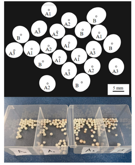 Existing literature shows that there are few research results in the pearl shape detection, particularly for batch pearls’ detection. Many detection methods are applied to a single pearl to measure the thickness of the pearl layer [6,7], pearl donor [8], internal structure [9,10], luster [11,12], color [13,14], etc. Although single pearl detection can analyze the surface and internal quality of the pearls from multiple angles [15], most of them are limited to laboratory environments. In addition, the market demands more for processing a batch of pearls at the same time; but batch pearl detection suffers from measurement accuracy due to mutual contact between pearls. Therefore, it is necessary to analyze and summarize the contact problems of batches of pearls.