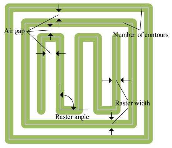 Raster width represents the width of the printed beads or roads for rasters. It depends on the nozzle tip size. Some researchers distinguish contour width from raster width [80,81], as shown in Figure 1. However, in most studies, contour width and raster width are regarded as the same parameter, represented by road width [11,65,82].