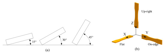 Build orientation (or part orientation [23], construction/layer orientation [24]) represents how and in which direction the part is generated on the print platform. In fact, build orientation can represent an arbitrary angle with any value [8,25,26], but in most studies, it is regarded as a certain angle with respect to X, Y, and Z-axis [27,28]. Generally, when test specimens are placed horizontally, vertically, and laterally, the build orientation is named as flat, upright, and on-edge, respectively, which is shown in Figure 2. Flat and on-edge are considered parallel to the print platform, while upright is along the direction of normal of the print platform.
