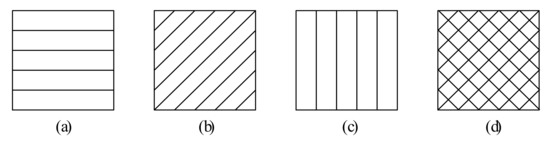 Raster angle (sometimes called raster orientation [40], layer orientation [41], fiber orientation [42], or even pattern orientation [43]) represents the angle of the filament direction with regard to the X-axis (usually load direction) of the platform. The allowed raster angles can vary from −90° to 90°, and typically used values are 0° (axial), 45°(cross), 90° (transverse), and their combination. For example, −45°/45°(criss-cross) represents the raster printing directions are −45° and 45° alternately for different layers, as shown in Figure 3.