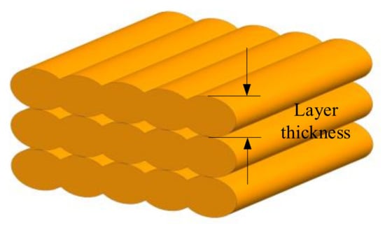 Layer thickness (or layer height [64]) represents the thickness of the layer printed by the nozzle tip, as shown in Figure 4. In general, it is smaller than the diameter of the extrusion nozzle (usually one-half), depending on the material and tip size. Layer thickness is directly related to the number of layers printed and hence print time. It has been verified that better accuracy of the component can be achieved by setting lower layer thickness.