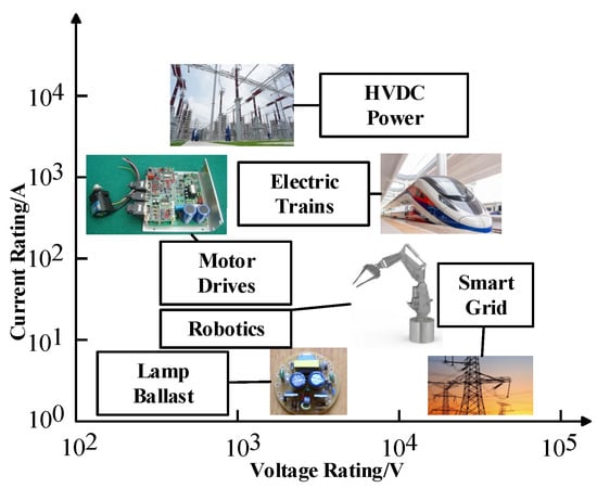In modern society, PE (Power Electronics) systems are widely used in industrial and household applications for controlling and converting electrical energy [1]. In new energy vehicles, railways, automated manufacturing systems, wind power generation and other fields, PE systems can save energy and make structures more compact. In the past few years, power semiconductors including IGBT modules have dominated the power converter market due to their excellent performance, low cost, reliability, light weight, and small size [2,3]. One of the most important power conversion devices, IGBTs were invented in 1982, which accelerated the application of bipolar devices in high voltage and large current markets [4,5]. As shown in Figure 1, the IGBT is applied to a wide range of current and voltage levels [6]. In applications except smart grids, the rated current of IGBTs increases with the increase of rated voltage. For silicon-based IGBTs, this problem can be solved by using multi-chip power modules. A more advanced solution is to use the third-generation semiconductors, which can work at higher frequencies than silicon-based IGBTs. At present, in the application fields requiring medium and high power, the traditional low-switching frequency silicon IGBTs and the emerging high-cost SiC MOSFETs cannot simultaneously meet the performance and cost requirements of converters. While SiC-based IGBTs have great theoretical advantages compared with other high-voltage devices, poor wafer quality and immature manufacturing technology hinder the commercialization of SiC-based IGBTs [7]. Therefore, SiC-based IGBT modules are still in the research and development stage. Compared with pure silicon IGBT modules, hybrid IGBT modules have low cost and low technical requirements. In addition, hybrid IGBT modules have better heat dissipation performance than pure silicon modules. Therefore, hybrid modules are conducive to the transition from silicon IGBT modules to SiC-based IGBT modules.
