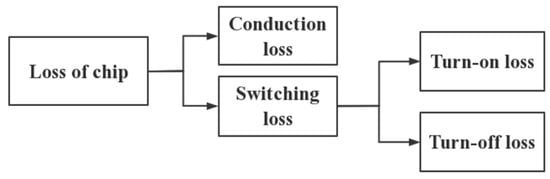 Thermal management and cooling solutions are an issue of increasing concern for IGBT modules because of their increasing heat loss in a wide range of applications [19,20]. These losses can be further divided into two categories, namely conduction loss and switching loss. For the IGBT module, the thermal loss of the IGBT chips and FWD (free-wheeling diode) chips are mainly considered. The composition of the thermal loss is shown in Figure 2 [21]. The loss of the chip is as follows: