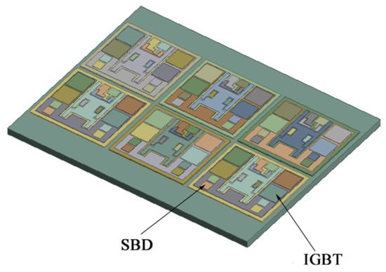 From top to bottom, IGBT modules can be divided into the chip, chip solder layer, DBC (direct bonded copper) upper copper layer, ceramic layer, DBC lower copper layer), DBC lower solder layer, substrate, and heatsink [25,26]. This research used a 3300 V/1500 high-voltage module with multilayer packaging method, in which the power part was integrated on the substrate through packaging technology. The power module consisted of six modules in parallel, each containing four Si IGBT chips (13.5 × 13.5 mm) and four SiC SBD chips (6.5 × 6.5 mm). Especially for FWD, the SiC SBD (Schottky Barrier Diode) chips replace the traditional Si FRD (fast recovery diode). Every two modules constituted a subsystem, and the rated current of each subsystem was 500 A. A hybrid IGBT module can withstand higher working temperature and greater power shock; some traditional electronic packaging connection methods such as lead solder and lead-free solder cannot meet the needs of high-temperature applications. Due to the high melting point of nano-silver solder, it will not melt during the second welding. Therefore, for research described in this paper, nano-silver solder paste was used as chip solder and 96.5Sn3.0Ag0.5Cu (SAC305) was used as DBC solder. The substrate and heatsink were connected by thermal conductive silicone. The cross-sectional views of the model and the water-cooled structure are shown in Figure 6 and Figure 7.