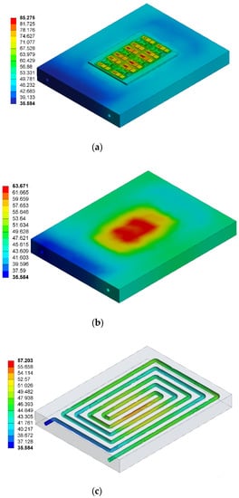 It can be seen from Figure 8a that as the heat source of the IGBT heat dissipation module, the chips have the highest temperature. The heat emitted by the chip diffuses downward from the bottom of the chip, and the heat dissipation and diffusion area after each layer increase continuously. In addition, the size of SBD chips is smaller than that of IGBT chips, so SBD chips withstand more heat flux than IGBT chips, resulting in them having a higher temperature than IGBT chips; the highest temperature reached 85.275 °C. Figure 8b shows the temperature distribution of the heatsink. It can be seen from the figure that the high temperature of the heatsink is concentrated in the central area of the upper surface, and the maximum temperature is 63.675 °C. The temperature spreads rapidly around, and the temperature difference is obvious. Figure 8c shows the temperature distribution of the water-cooled channel. It can be seen from the figure that the flow temperature increases gradually with the flow and the temperature at the outlet decreases gradually. The flow temperature below the heat source reaches the highest level of 57.203 °C, and the temperature at the outlet is 35.584 °C.