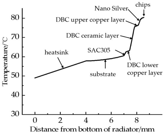 The material and thickness of each layer in the IGBT module can affect the temperature distribution. The thermal resistance of the IGBT shell is the sum of the junction temperature of each layer in series during the heat dissipation of the IGBT module. Therefore, the influence of the thermal resistance of each layer in the IGBT module on temperature distribution has been studied in detail. The SBD chip is the highest point of the temperature distribution of the whole IGBT module. The vertical direction of the center of the upper surface of the SBD chip is taken as the profile, and the lower surface of the heatsink is taken as the ordinate. From bottom to top, they are heatsink, thermal conductive silicone, substrate, DBC solder layer, DBC lower copper layer, DBC ceramic layer, DBC upper copper layer, chip solder layer, and chip. Figure 9 shows the temperature distribution of the IGBT module along the longitudinal axis.