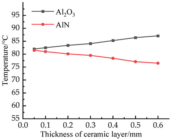 Considering the significant influence of the DBC ceramic layer on IGBT module temperature, the influence of changing the thickness of AlN and Al2O3 on-chip junction temperature is discussed. The results are shown in Figure 10. Obviously, with the increase of thickness, the chip temperature decreases with the increase of AlN ceramic layer thickness and increases with the increase of Al2O3 ceramic layer thickness. The influence of the two materials on the chip junction temperature is exactly the opposite. This is due to the high thermal conductivity of AlN and the low thermal conductivity of Al2O3. It can also be seen from the diagram that with the decrease of the thickness of the DBC ceramic layer, the temperature gap between the two materials is gradually reduced. Therefore, Al2O3 can be used to save costs within the allowable range of process conditions. Especially for high-power modules with large heat dissipation requirements, if AlN is used as the DBC ceramic layer material, the thickness should be increased as much as possible under the condition of allowable cost. If Al2O3 is used as the DBC ceramic layer material, the thickness should be reduced as much as possible under the condition of allowable mechanical strength. In addition, the choice of materials should not only rely on thermal conductivity but also consider the impact of various materials on the module.