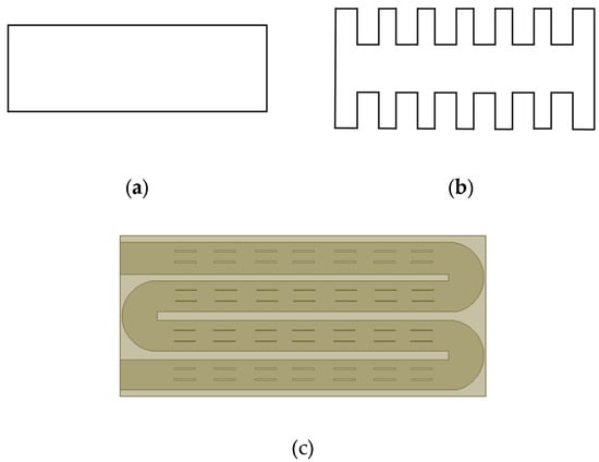 Three different flow channel structures of the heatsink: (a) Rectangular structure, (b) Concave–convex structure, (c) Fin structure.