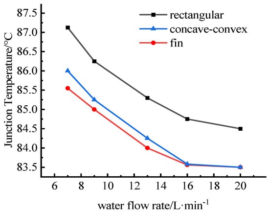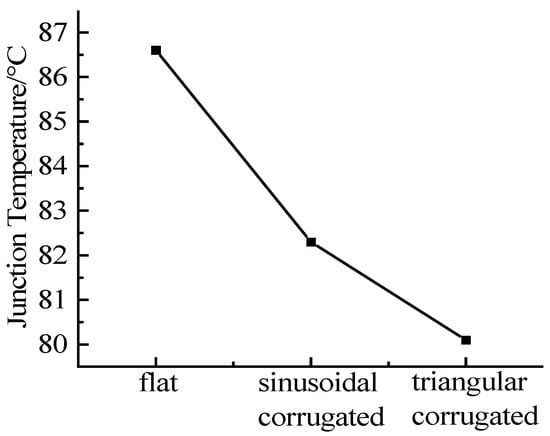 The thickness of the fins was set to 2 mm, the number of fins was 28, the inlet temperature was 25 °C, and the flow rate was 16 L·min−1. Except for the structural form of the fins, other boundary conditions were the same. The geometric models of the three fin structures are simulated respectively, and the maximum junction temperatures of the three structures are shown in Figure 16.
