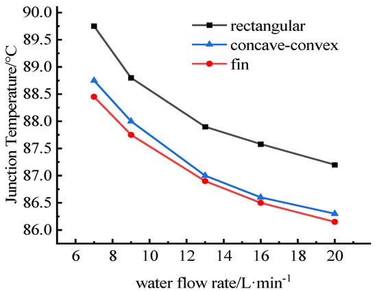 The relationships between the water flow rate and the junction temperatures are shown in Figure 12 and Figure 13. It can be seen that the junction temperatures of IGBT chips and SBD chips decrease with the increase of cooling water flow. Compared with before optimization, the junction temperature of the optimized heat dissipation channel is significantly lower. The junction temperature difference between models a and b is smaller, and the temperature curves are closer, and with the increase of flow, the temperature curves of concave-convex structure and fin structure are close to coincidence. When the flow rate is the same, the junction temperature of the IGBTs with rectangular flow channel is the highest, while that of the IGBTs with fin flow channel is the lowest.