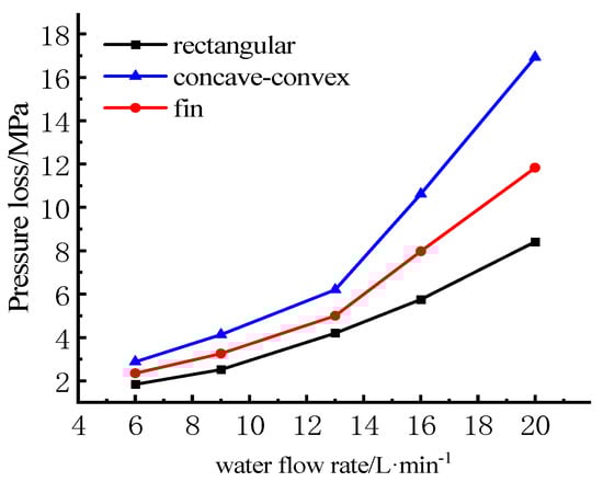 The relationships between water flow rate and pressure are shown in Figure 14. It can be seen from the figure that as the water flow rate increases, the pressure loss of each model shows an exponentially increasing relationship. When the coolant flow rate exceeds a certain value, the pressure loss will rise sharply. Compared with rectangular structure, the pressure loss of concave-convex structures and fin structures is larger, which is due to the existence of the fin increasing the spoiler effect. The pressure loss of cooling water will directly affect the energy consumption of the pump. When the pressure loss increases, the energy consumption of the pump will also increase, and the risk of coolant leakage will also increase. Combined with the pressure distribution and junction temperature distribution, considering that the design of concave–convex structures will increase the width of the cross-sectional area so as to increase the overall volume of the module, in addition, compared with other structures, the fin structure has good fluid resistance, so it is undoubtedly a good choice to increase the spoiler fin in the flow channel.