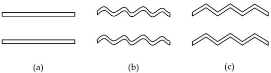 Three different structures: (a) Flat fin, (b) Sinusoidal corrugated fin, (c) Triangular corrugated fin.