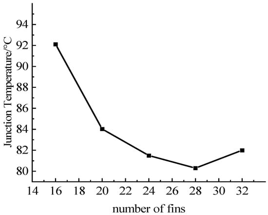 Due to the space constraints of the IGBT module, the number of fins was set from 16 to 32 groups for simulation, the fin structure was sinusoidal corrugated fins, and the thickness of the fins was set to 2 mm. The obtained relationships between the number of fins and the maximum junction temperature of the chips are shown in Figure 17. The data in the table show that when the number of fins increases, the maximum temperature of the IGBT decreases. The reason is that the number of fins decreases and the convection heat transfer area increases, thereby improving the heat dissipation performance. However, an excessive number of fins will increase the pressure drop, and the flow rate will decrease when the flow rate of the water inlet remains unchanged, which in turn will weaken the heat dissipation effect. Therefore, increasing the number of fins must be carried out under the pressure drop requirements.