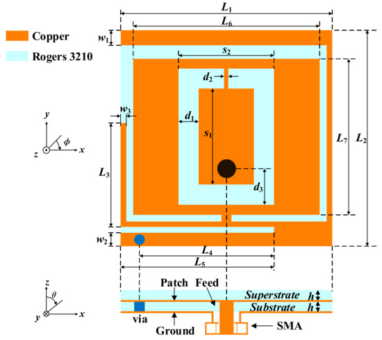 The configuration of the proposed implantable antenna is displayed in Figure 1. The optimized dimensions with the electromagnetic numerical simulation software ANSYS HFSS v.18 are listed in Table 1. The radiation patch is printed on the substrate of Rogers 3210 with a relative permittivity of εr = 10.2 and a loss tangent of tan δ = 0.003; it is covered with a superstrate of the same material, which can isolate the radiation patch from the surrounding human tissues and plays a buffer role between the conducting radiation patch and lossy human tissues.