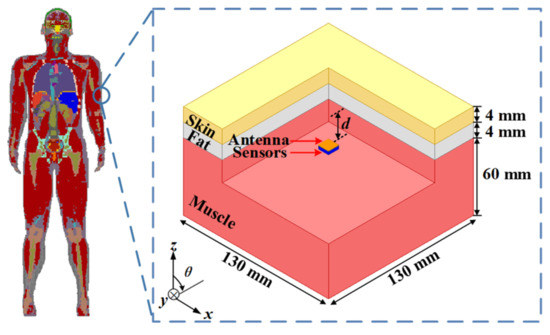 In the simulation analysis, the three-layer phantom in Figure 2 was employed to evaluate the performance of the proposed antenna. The thicknesses of the skin, fat, and muscle layers were 4 mm, 4 mm, and 60 mm, respectively. The proposed antenna was implanted in the muscle layer. The distance from the antenna to the bottom of the fat was 4 mm, and the total depth of the implantation was 12 mm. In the simulation of the dual-band antenna, the dielectric properties of human tissues, such as relative permittivity and loss tangent, should be set as the values at the center frequency in the two target bands [25]. The detailed dielectric properties are listed in Table 2.