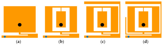 Evolution of the proposed antenna topology in (a) Case 1, (b) Case 2, (c) Case 3, and (d) Case 4.
