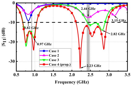 The detailed steps of the simulation are shown in Figure 3, and the simulated results for different cases are analyzed in Figure 4. In Case 1, to achieve miniaturization, a rectangular patch with a metal branch and via was introduced to form a PIFA, resulting in a resonant frequency at 0.82 GHz, near the 915-MHz ISM band. To achieve the performance of the dual band, a C-shaped slot was etched in the middle of the rectangular patch to form multiple independent current paths in Case 2, which added two resonant frequencies at 2.44 GHz and 3.15 GHz, near the 2.45-GHz ISM band. In Case 3, a long L-shaped metal branch on the right side was loaded to extend the bandwidth of the antenna at the 915-MHz ISM band, which excited the 0.25λ monopole mode at 0.97 GHz. The resonant frequency at 0.97 GHz was close to the original resonant frequency in Case 1, which expanded the bandwidth at the low-frequency band. Meanwhile, the long L-shaped metal branch extended the current path at 3.15 GHz in Case 2, which reduced the resonant frequency to 2.82 GHz and improved the impedance matching. To further expand the bandwidth at the 2.45-GHz ISM band, a L-shaped metal branch on the left side was introduced in Case 4, which excited the 0.25 λ monopole mode at 2.23 GHz. Therefore, the three resonant frequencies excited at the upper frequency band were close to each other, which expanded the bandwidth of the proposed antenna at the 2.45-GHz ISM band. As a result, wide bandwidths in 915-MHz ISM and 2.45-GHz ISM were produced.
