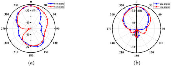 Figure 5 shows the radiation patterns of the proposed antenna at 915 MHz and 2.45 GHz, with peak gains of −28.9 dBi and −29.5 dBi, respectively. Due to the effect of the human tissues, the back lobe of the radiation pattern at 915 MHz is a little large. Nevertheless, since the 915-MHz ISM band is used for receiving RF energy in WPT, there can be no backward radiation to the human body. The radiation pattern at 2.45 GHz has good orientation, making it very suitable for data transmission with external medical devices.