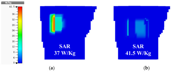 In addition, because the implantable antenna is placed in the human body, the electromagnetic field generated by the antenna interacts with that of the human body to produce biological effects that interfere with the electromagnetic environment in the organism. Thus, the human body manifests symptoms such as headache, memory loss, and heart failure, and the skin may also burn. These damages to the human body are long-term and chronic. The specific absorption rate (SAR), defined as the RF power absorbed per unit of mass of an object (in W/kg), is one important index, reflecting whether an implantable antenna radiates safely. Therefore, it is necessary to evaluate the SAR of the proposed antenna in the Hugo human phantom. Figure 10 shows the simulated SAR distributions for 10-gram tissues at 915 MHz and 2.45 GHz with an input power of 1 W. The maximum SAR values at two frequencies were 37 W/kg and 41.5 W/kg, respectively; according to IEEE C95.1-2005 [26], the maximum value of the average SAR of any 10-gram tissue should be limited to 2 W/kg. As a result, the simulated results show that the maximum input power of the proposed antenna at 915 MHz and 2.45 GHz should not exceed 54.1 mW and 48.2 mW in order to ensure radiation safety.