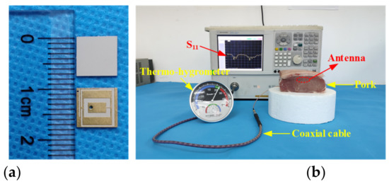To test the performance of implantable antennas conveniently, many scholars simply mimic skin or muscle via tissue-equivalent fluid. Although this method can easily achieve the permittivity and conductivity of skin or muscle at a single frequency, it is not suitable for the measurement of multiband implantable antennas. For multiband implantable antennas, animal tissues are the preferred measurement environment due to the fact that the electrical characteristics of animal tissues are frequency-dependent and similar to human tissues. Figure 11 shows the schematic diagram of a measurement employing the animal tissue of fresh pork. The proposed antenna implanted in the pork was connected to the vector network analyzer through the coaxial cable.