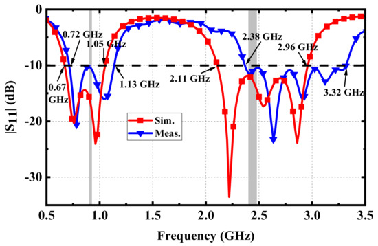 It can be seen from the measurement result in Figure 12 that the measured |S11| in the lower-frequency band was consistent with the simulated result, while the frequency offset in the upper frequency band was obvious. The reason for this may be that the gap between the radiation patch and the superstrate was generated unintentionally during the manual welding of the feed. This can be avoided by using precision processing equipment. Nevertheless, the measured |S11|of the proposed antenna can still cover the ISM bands of 902–928 MHz and 2.4–2.48 GHz. The measured relative bandwidths were 44.3% (0.72–1.13 GHz) and 33.0% (2.38–3.32 GHz) in the two frequency bands, respectively, both of which were close to the relative bandwidths in the simulation.