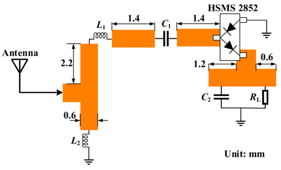 In RF energy-harvesting systems using microwave radiation, the function of the implantable antenna is to receive the RF power from the energy source. Furthermore, the high-frequency rectifier circuit, which also plays a critical role in RF energy-harvesting systems, can convert the RF energy into a DC signal, powering or charging the IMDs. Therefore, it is necessary to design a rectifier circuit in the working frequency band of the proposed antenna to achieve the conversion and utilization of RF power.