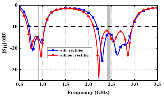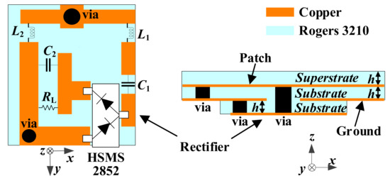 where PR represents the RF power received by the antenna, and PDC denotes the DC power output by the rectifier circuit. In addition, to be integrated with the implantable antenna as a whole, a substrate of Rogers 3210 was added under the ground of the proposed antenna. The rectifier circuit was placed on the back of the substrate, forming a rectenna. Figure 14 illustrates the optimized structure of the proposed rectenna. The rectifier circuit can be connected with the radiation patch and the ground of the proposed antenna through two vias. Figure 15 shows the effect on the proposed antenna after adding the rectifier circuit. The effects of inductors and capacitors are replaced by ideal conductors in HFSS. Since the substrate layer of the rectifier circuit is composed of Rogers 3210, its relative permittivity is lower than that of human muscle. Therefore, after adding the substrate layer of rectifier circuit, the equivalent permittivity around the proposed antenna becomes lower, which makes the resonant frequencies shift to higher frequencies. A slight offset has little effect on the antenna due to the wide bandwidth and the full ground, guaranteeing that the proposed antenna has good robustness.
